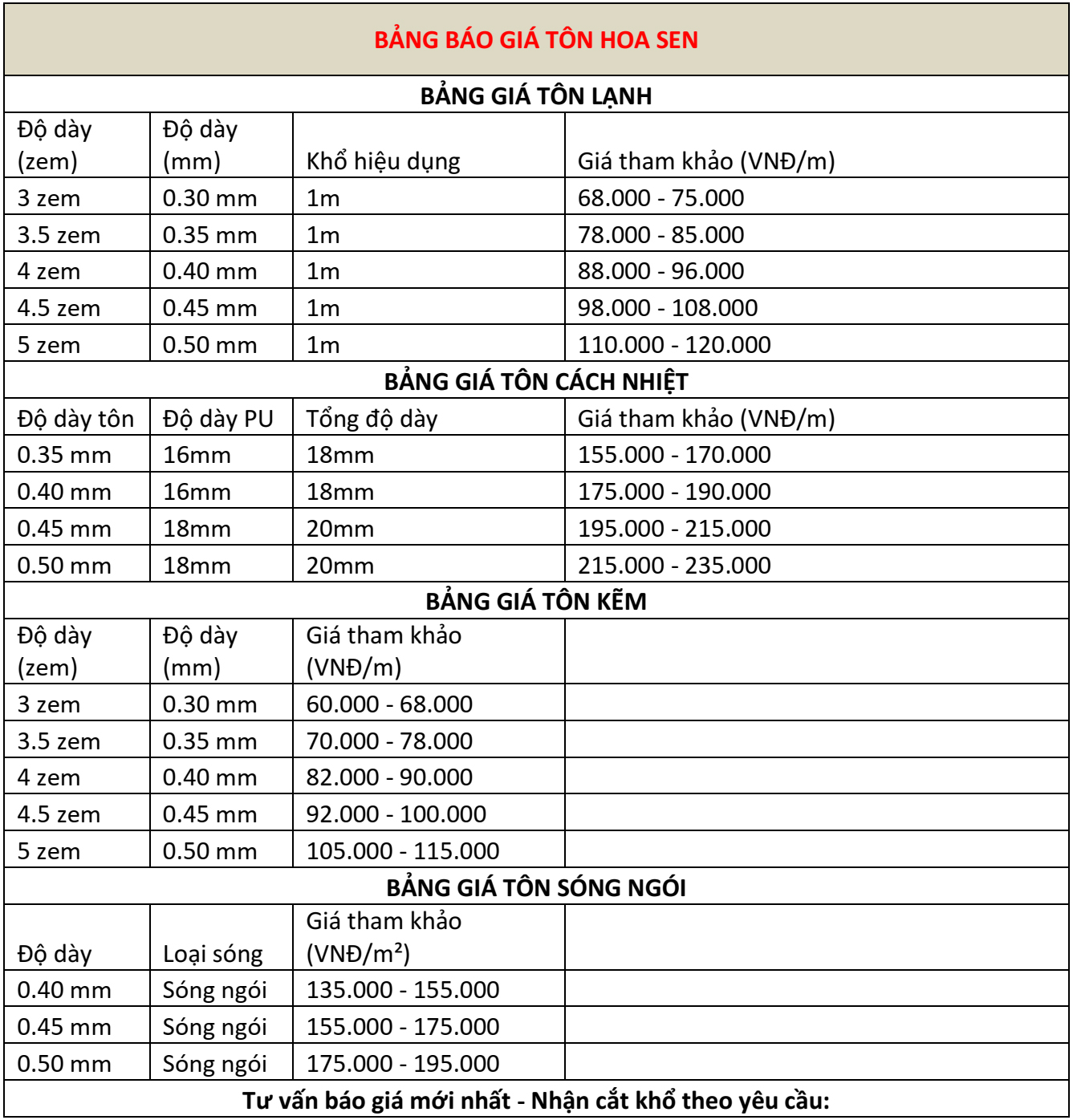 - Giá tôn lạnh Hoa Sen dao động từ 69.000 đ đến 145.000 đ